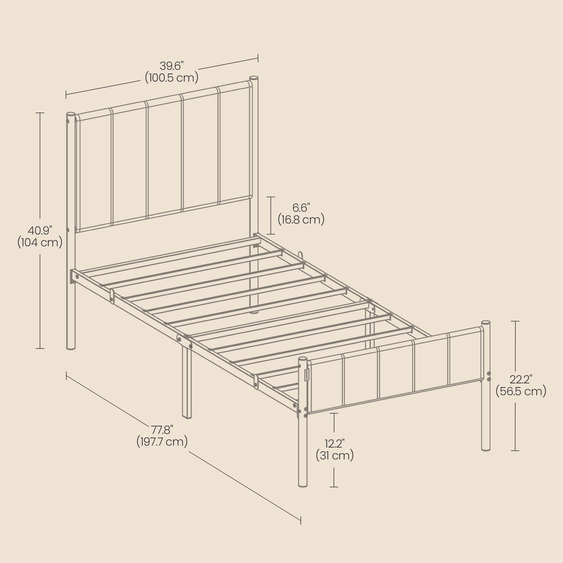 Featuring a clean minimalist design, this twin-size metal bed frame includes a cozy upholstered headboard with high-density foam for comfortable support during activities like reading. Its sturdy painted steel frame with six support legs and sound isolators ensures stable, quiet support for up to 550 lbs, while the 12.4-inch underbed clearance offers useful storage space and easy cleaning access. With snap-on slats and straightforward instructions, it assembles quickly and easily without a box spring.