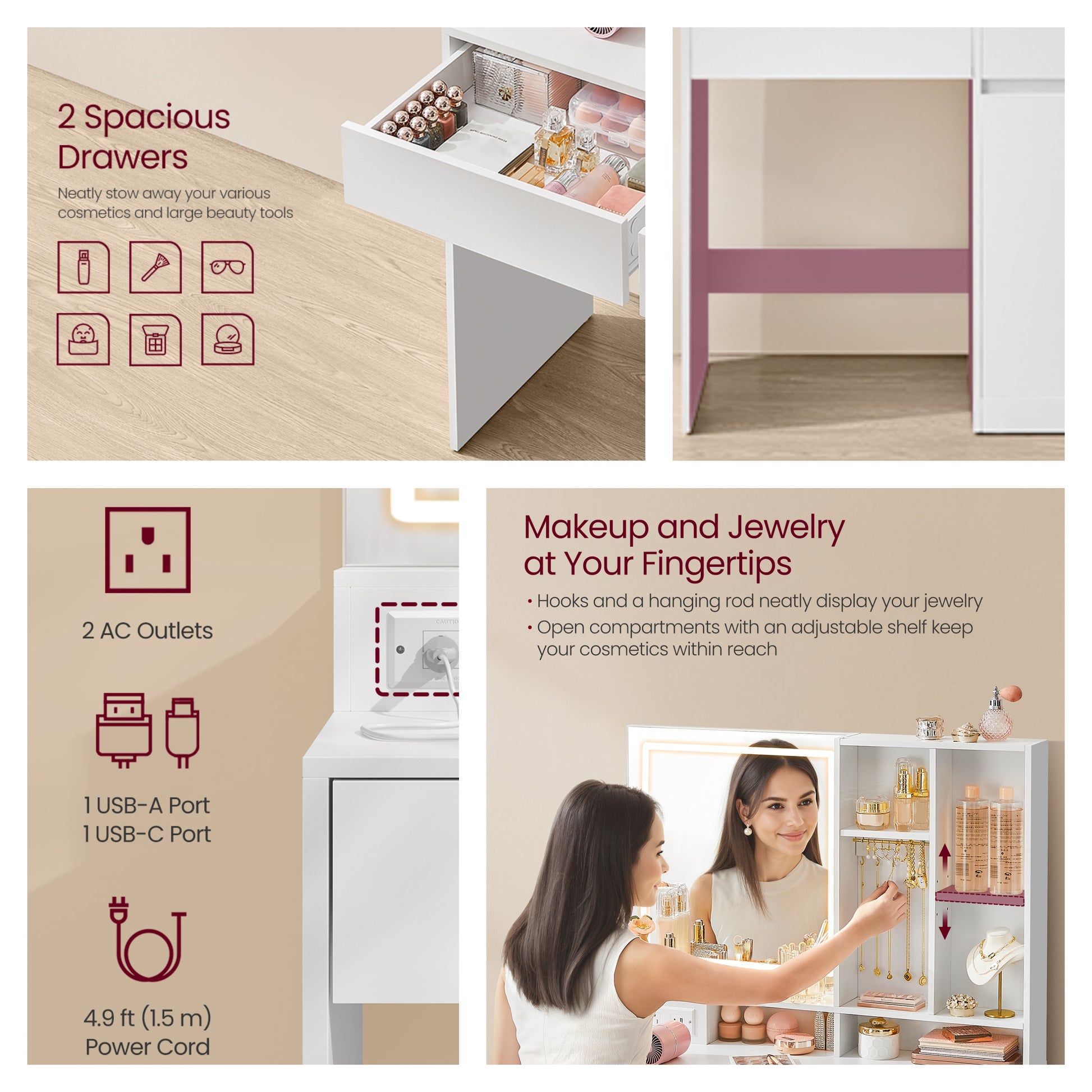 Vanity Desk with Power Outlets & LED Mirror, Makeup Table Set with Stool, 2 Drawers, 6 Compartments, Adjustable Shelf, for Bedroom, Cloud White